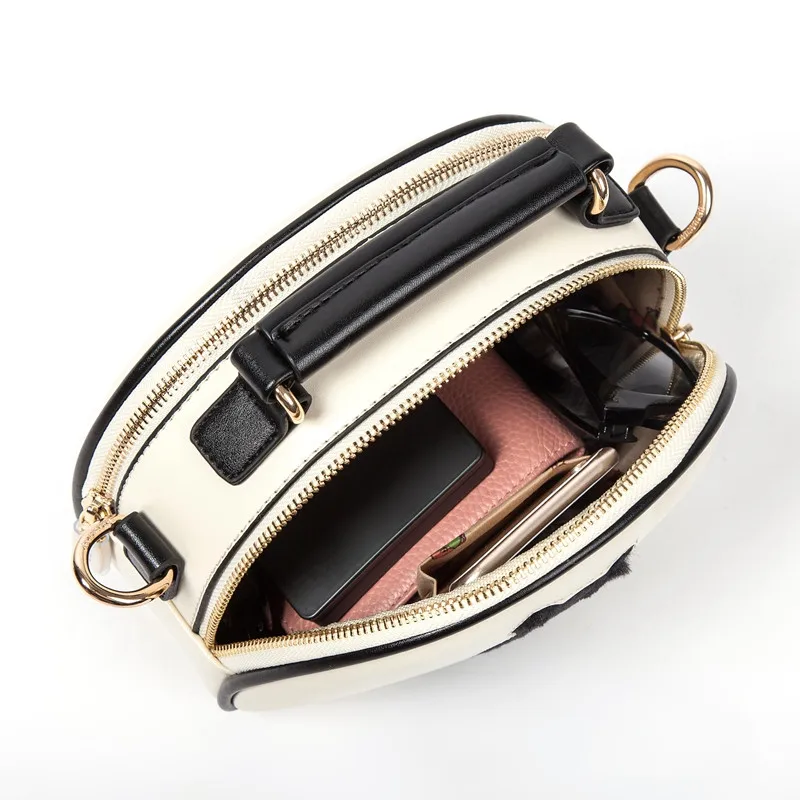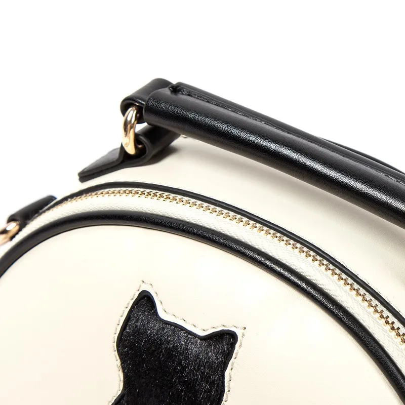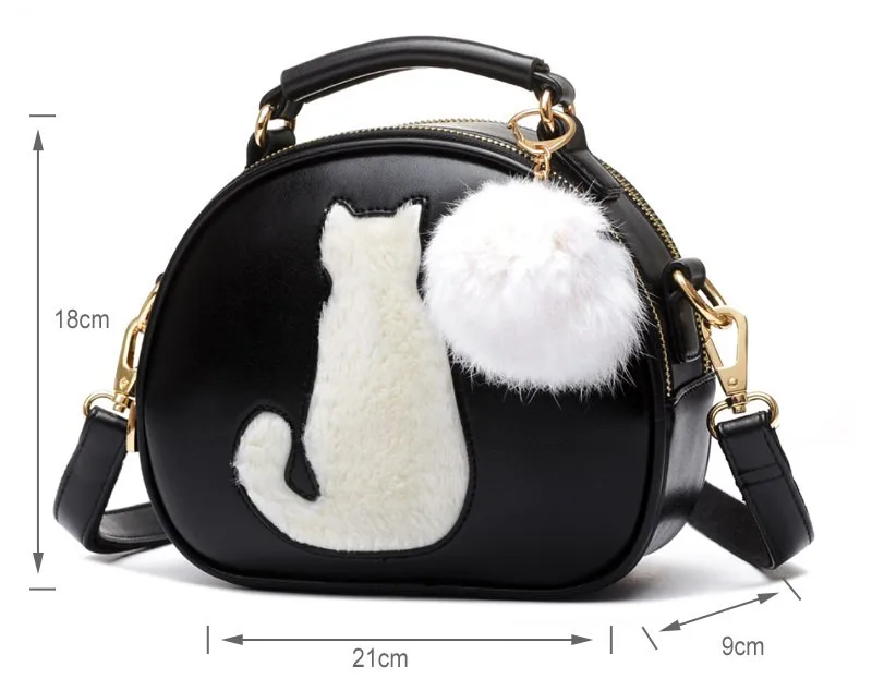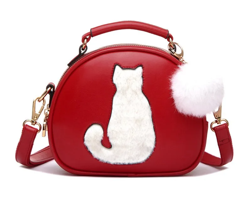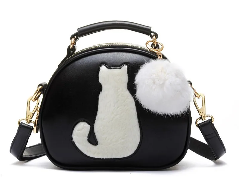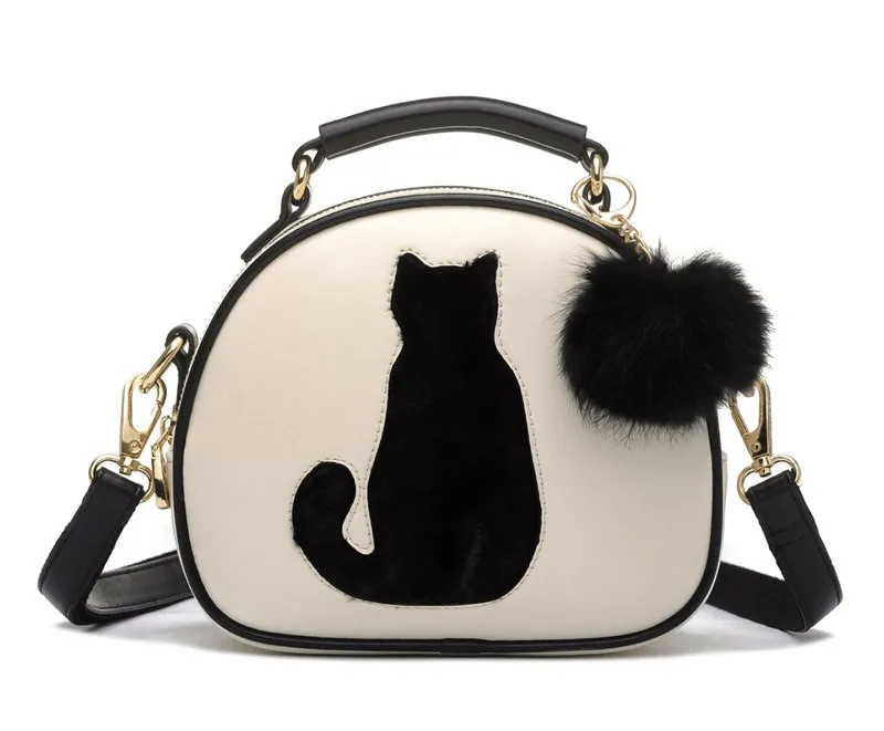 Cat Imprinted Leather Handbag With Fur Ball For Women