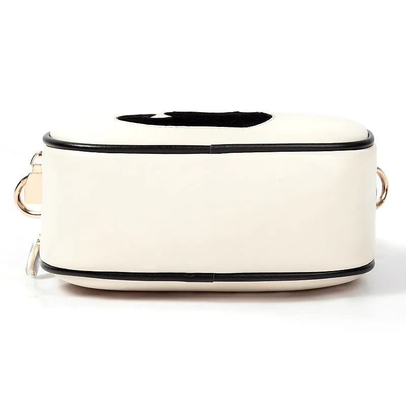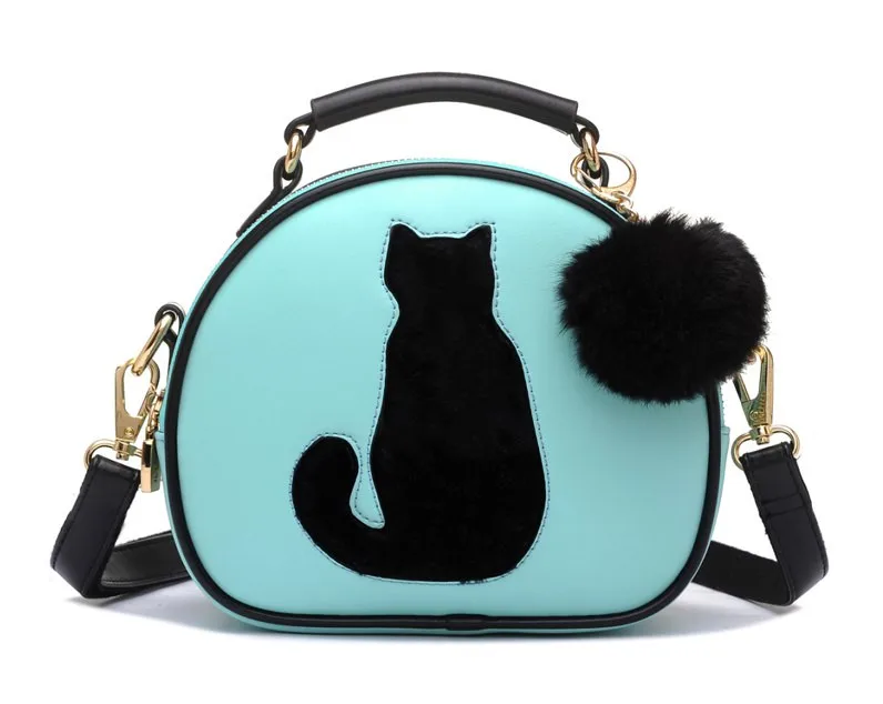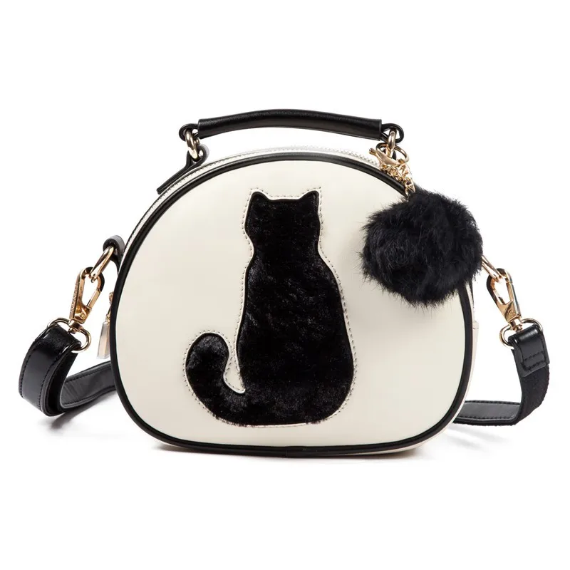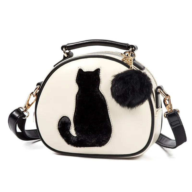 Cat Imprinted Leather Handbag With Fur Ball For Women